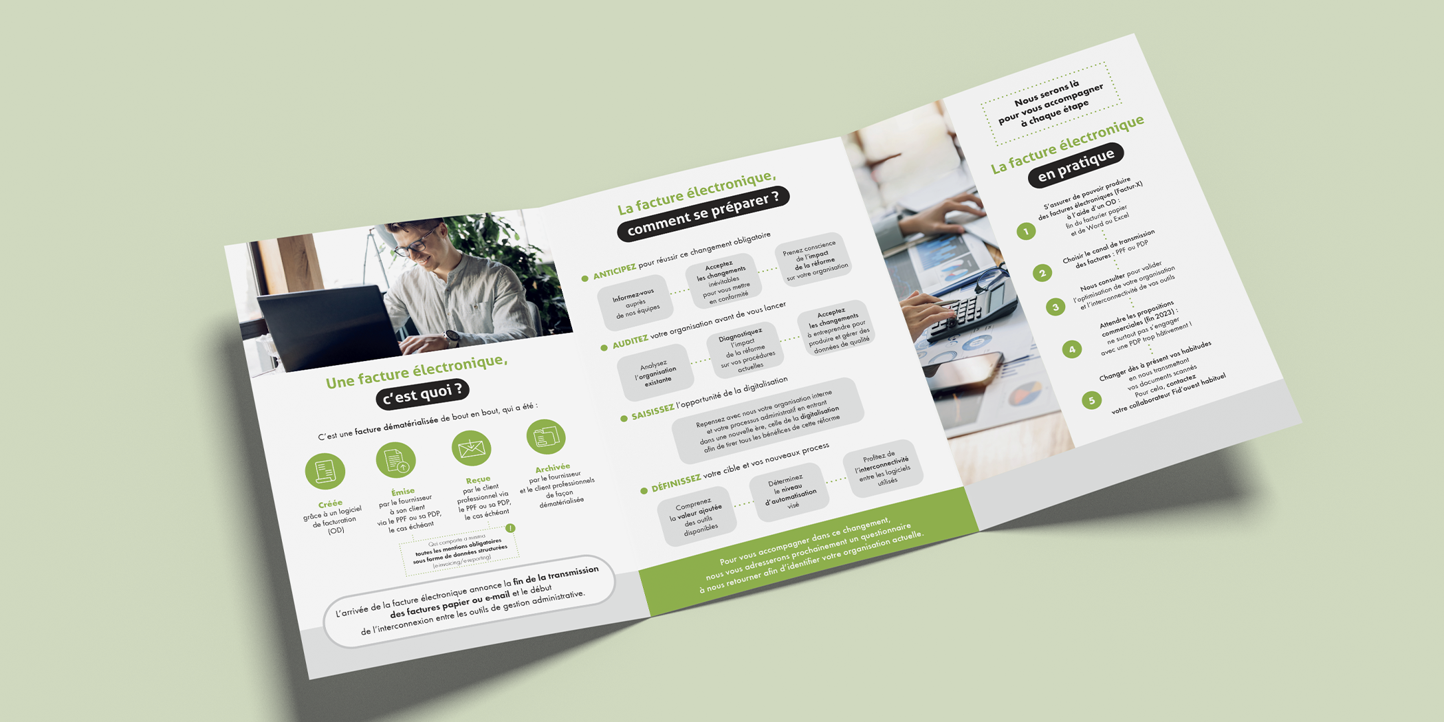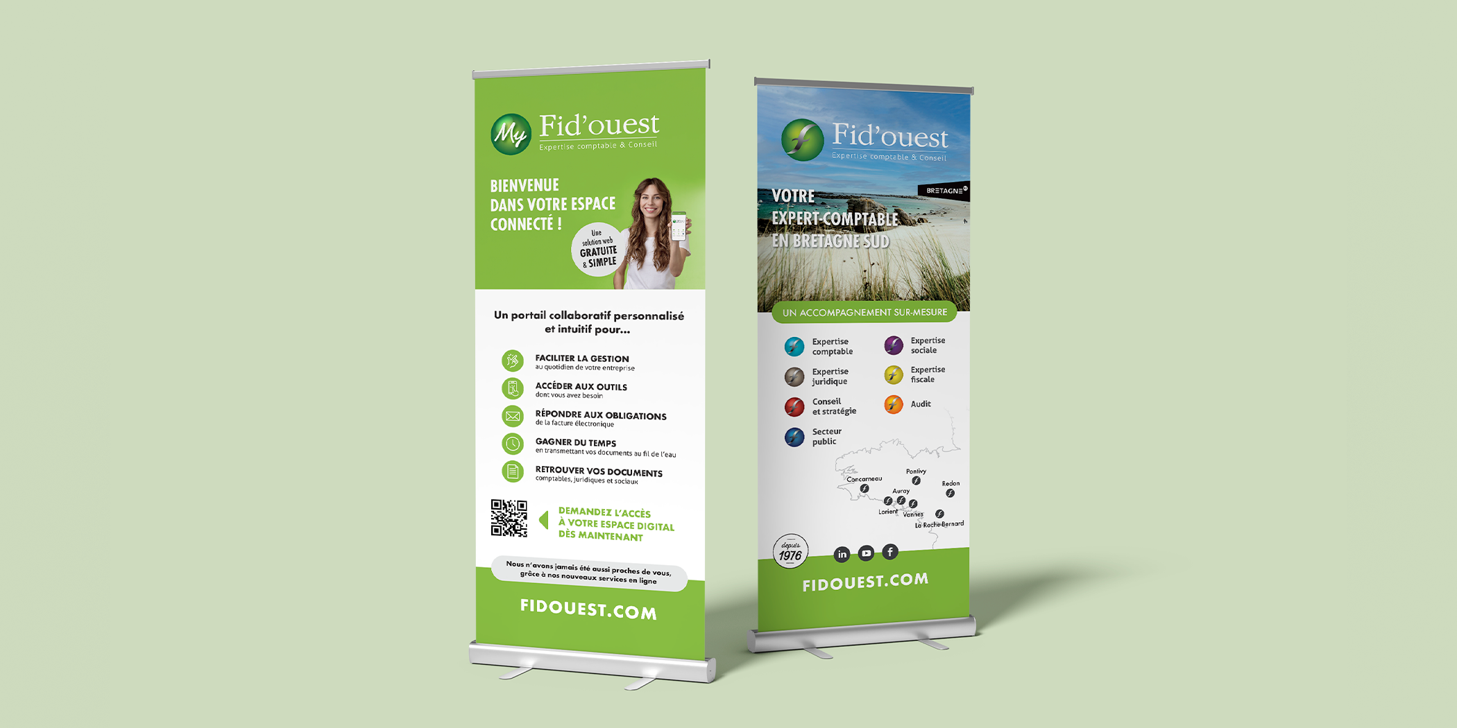 Une polyvalence dont a bénéficié Fid'ouest, le cabinet d'expertise comptable morbihannais. Nous avons créé des dépliants, mais aussi des goodies aux couleurs de l'entreprise : casquettes et parapluies, et réalisé la signalétique dans plusieurs de leurs locaux.