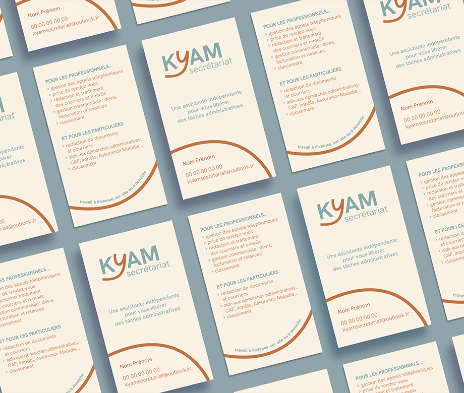 Kyam secrétariat nous a ainsi confié la réalisation de ses cartes de visite et flyers, lui permettant de présenter ses services avec professionnalisme et un vrai impact.